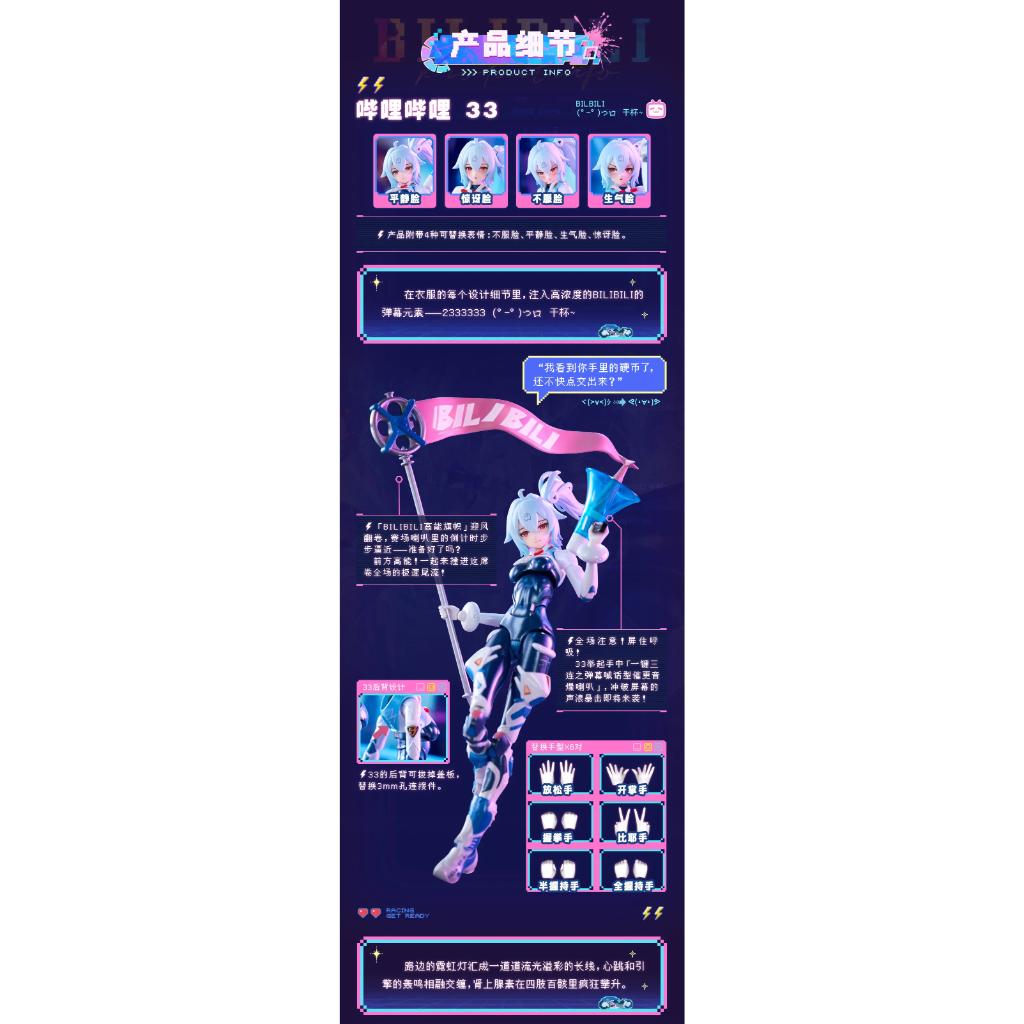 Designed and produced by Nuclear Gold Reconstruction, 33, the official poster girl for Bilibili, China's largest youth video-sharing platform, is available as a 1/12-scale action figure! Her outfit is printed with emoticons to give her a unique and adorable style. Her Full-Scale motorbike is designed with a stand so it can be displayed on its own. The flags are fluttering and the starting count is approaching; the excitement of the race is about to hit you! Are you ready? Order 33 and her beautiful beast of a bike for your own collection today!