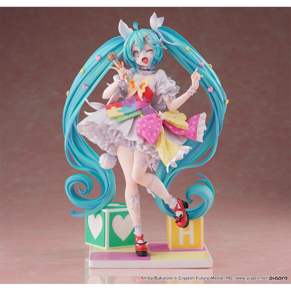 Hobby Stock turns the main visual of "Hatsune Miku Expo 2023 VR," drawn by the popular illustrator Bukurote, into a 1/7-scale figure! Miku's girlish dress, with all its brightly colored accessories, is carefully sculpted and painted to capture every detail; the support pillars are shaped like blocks, based on the background of the original illustration! Her base is included. You'll love her -- order her for your own collection today!