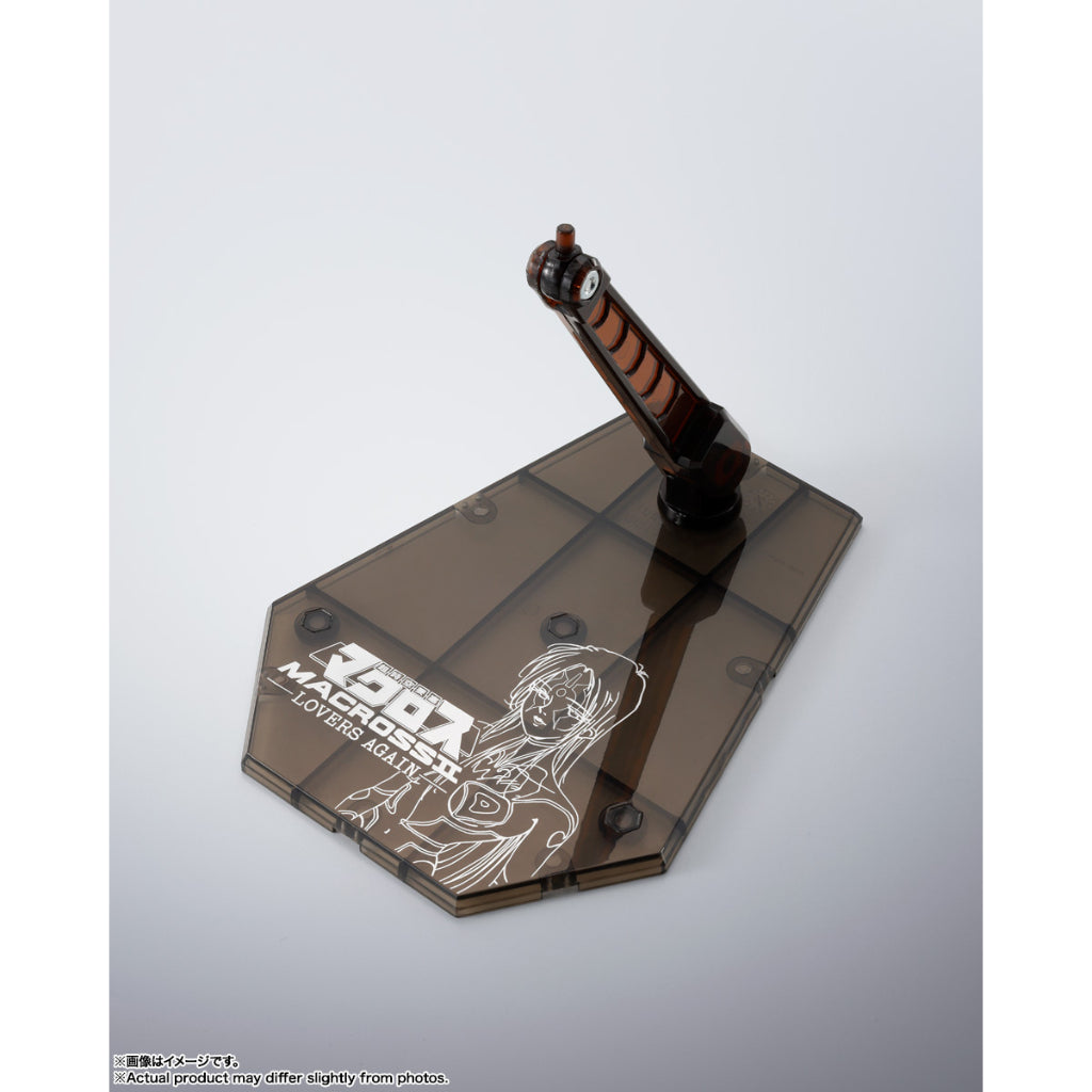 Bandai's "Hi-Metal R" version of the VF-2SS Valkyrie II from "Macross II: Lovers Again" is back, equipped with the Super Armed Pack (SAP)! The missile launcher and other parts are reproduced by opening and closing the hatch, and with parts replacement; in addition to the SAP, four Squire Drones are included. The Squire Drones can be displayed on the Tama Stage (sold separately). The Valkyrie II can be displayed with or without the SAP, and the Gerwalk form is recreated by replacing some of the toes; in Fighter form, the landing gear is recreated with parts replacement. The canopy is molded of clear parts, and a pilot figure of Silvie Gena is included that can fit into the cockpit. A special display base is included with the "Macross II" logo and an image of Ishtar, the singing shrine maiden; the Valkyrie II can be displayed in any of its three forms with the base. In addition, the package art is an original illustration by Goshi Nakamura!