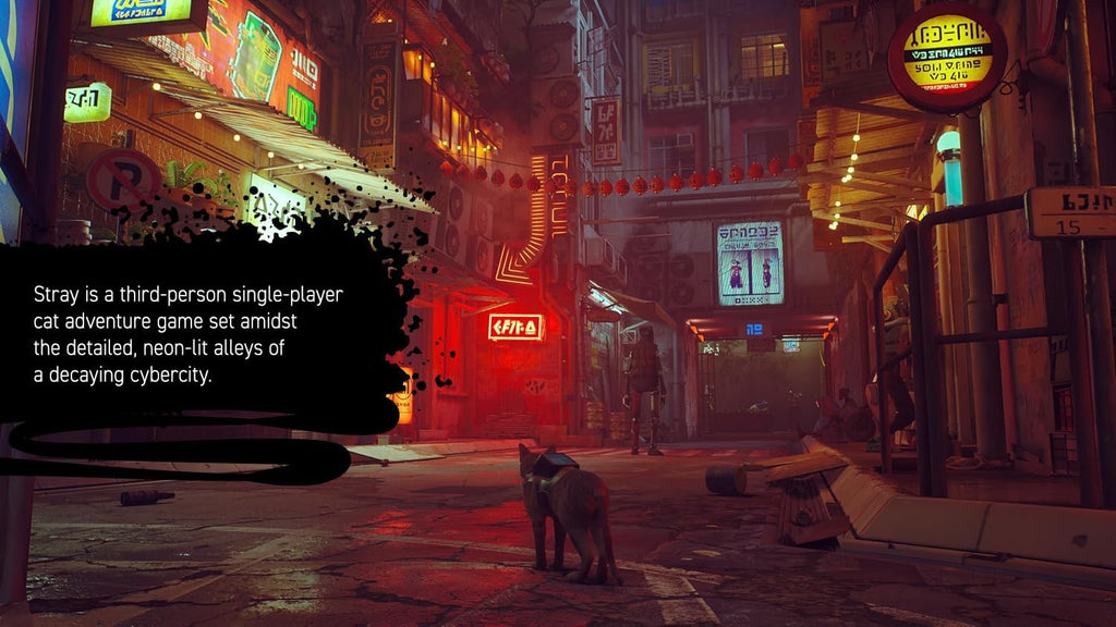 Stray is a third-person cat adventure game set amidst the detailed, neon-lit alleys of a decaying cybercity and the murky environments of its seedy underbelly. Roam surroundings high and low, defend against unforeseen threats and solve the mysteries of this unwelcoming place inhabited by curious droids and dangerous creatures.