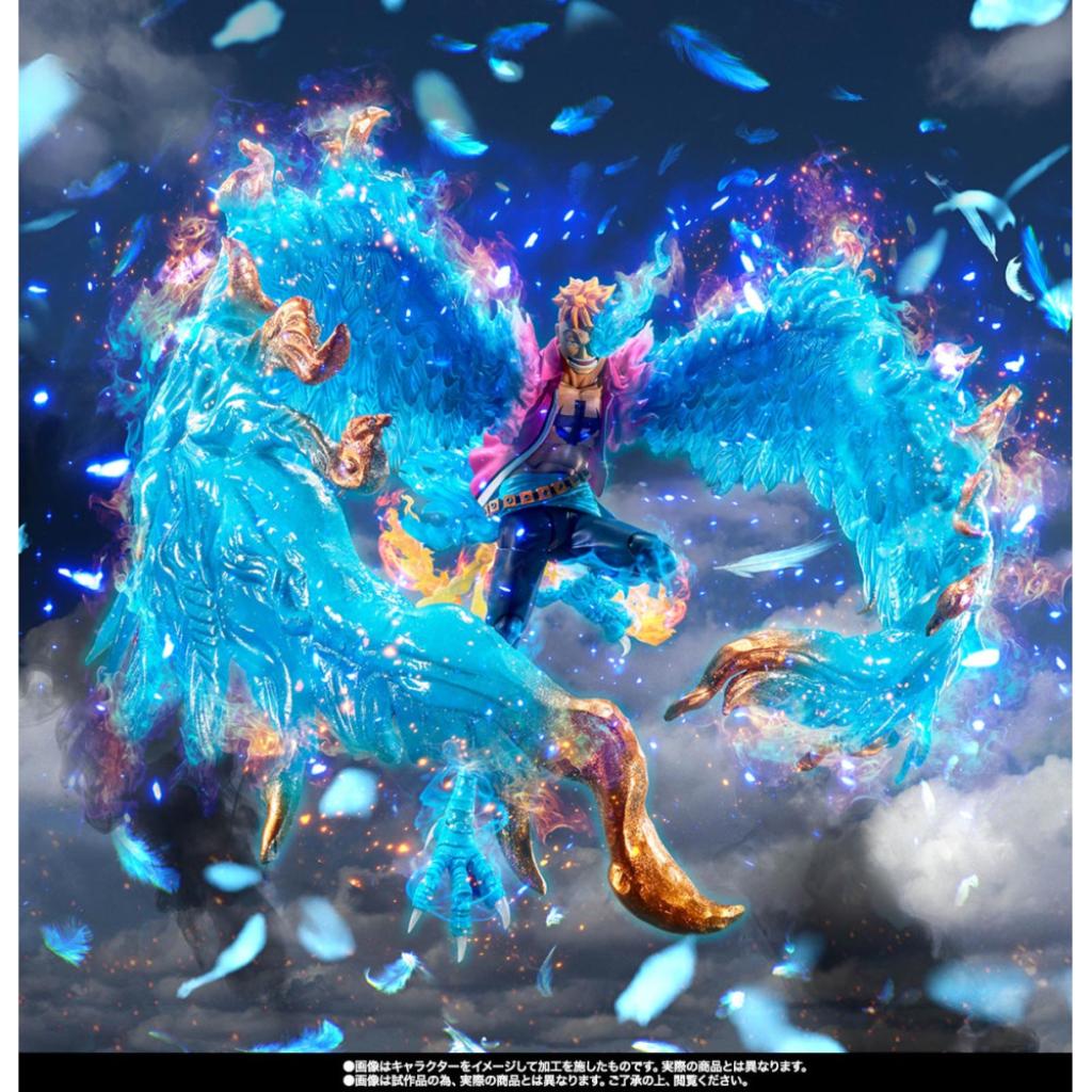 Marco is depicted during the Marineford Summit Battle with fully articulated joints and numerous optional parts. Includes bendable wings for ability activation poses, interchangeable hands, facial expressions, effect hair parts, beast-type parts, and a display stand.